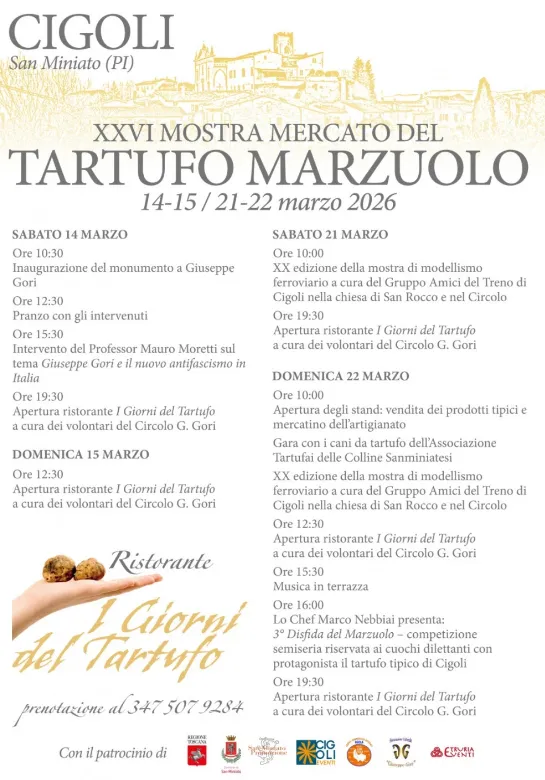 Il borgo di Cigoli, nel comune di San Miniato, ospita la ventiseiesima edizione della Mostra Mercato del Tartufo Marzuolo nei weekend del 14-15 e 21-22 marzo 2026.