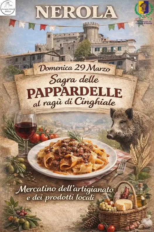 Domenica 29 marzo 2026, il borgo medievale di Nerola celebra la cucina tradizionale con l'attesa Sagra delle Pappardelle al Ragù di Cinghiale.
